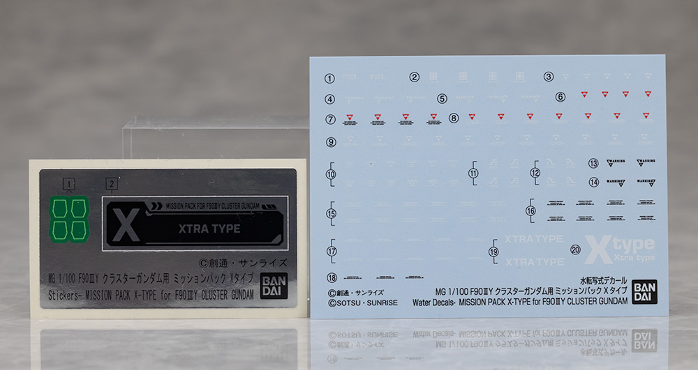 クラスターもキット化され、パックもほとんどが既にキット化されているMG F90シリーズ。今回はF90IIIY クラスターガンダム用ミッションパック Xタイプが新たにキット化されました。いつも通りプレミアムバンダイでの受注品で価格は3,850円です。今回もパッケージや説明書は単色かつ機体説明などもないシンプルな物でした。付属品はランディングギアパーツとPET製のビームシールドエフェク